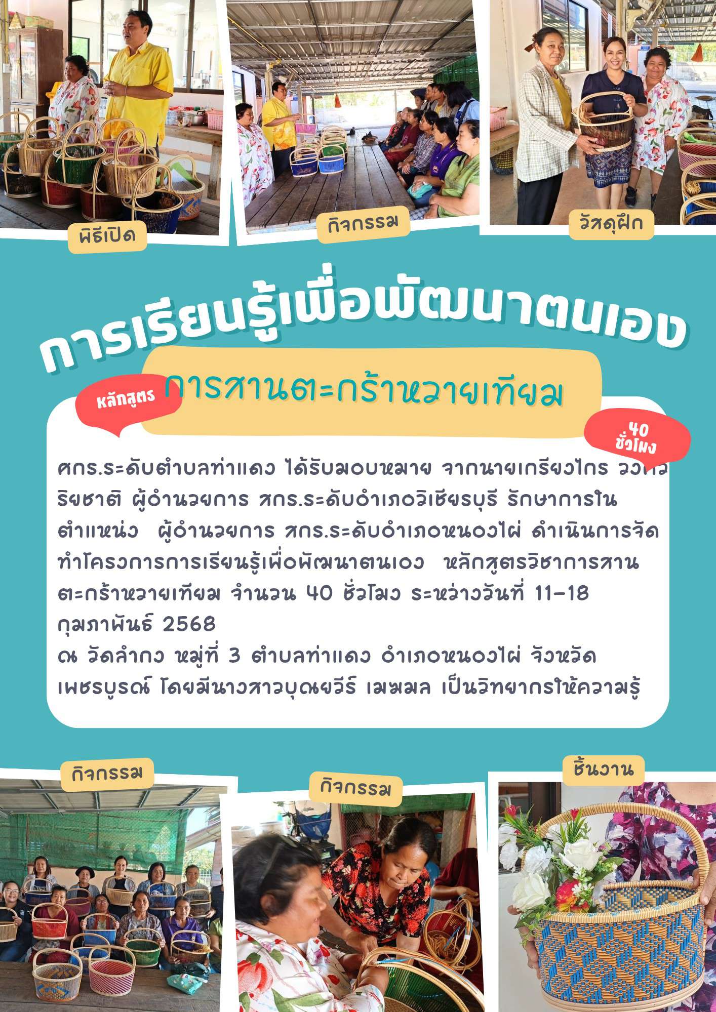 โครงการการเรียนรู้เพื่อพัฒนาตนเอง หลักสูตรวิชาการสานตะกร้าหวายเทียม จำนวน 40 ชั่วโมง