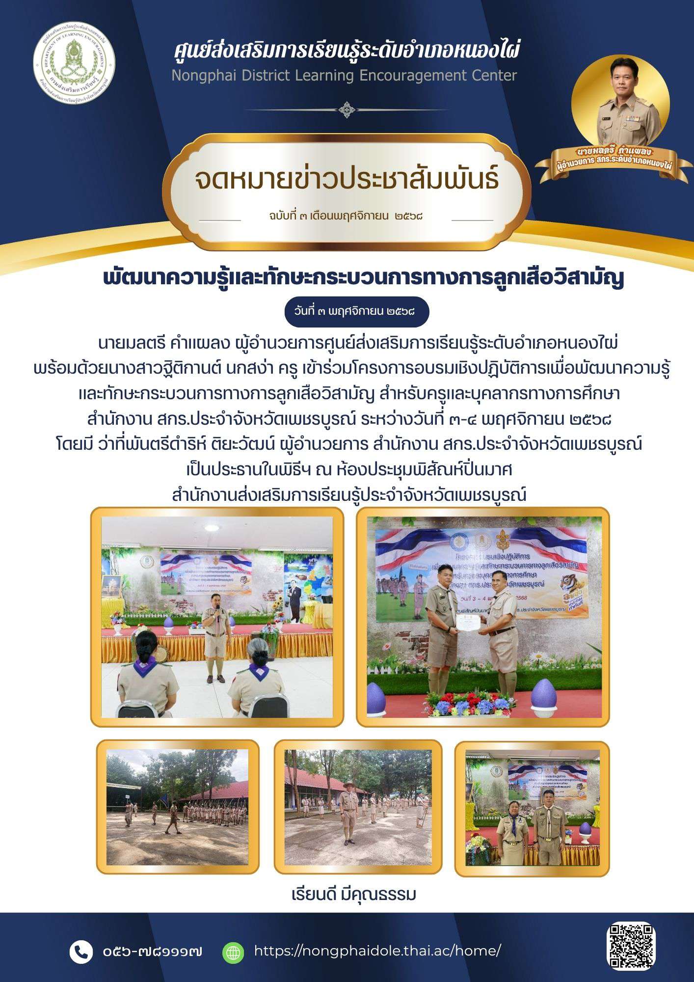 นายมลตรี คำแผลง ผู้อำนวยการศูนย์ส่งเสริมการเรียนรู้ระดับอำเภอหนองไผ่ พร้อมด้วยนางสาวฐิติกานต์ นกสง่า ครู เข้าร่วมโครงการอบรมเชิงปฏิบัติการเพื่อพัฒนาความรู้และทักษะกระบวนการทางการลูกเสือวิสามัญ สำหรับครูและบุคลากรทางการศึกษา สำนักงาน สกร.ประจำจังหวัดเพชรบูรณ์ ระหว่างวันที่ ๓-๔ พฤศจิกายน ๒๕๖๘